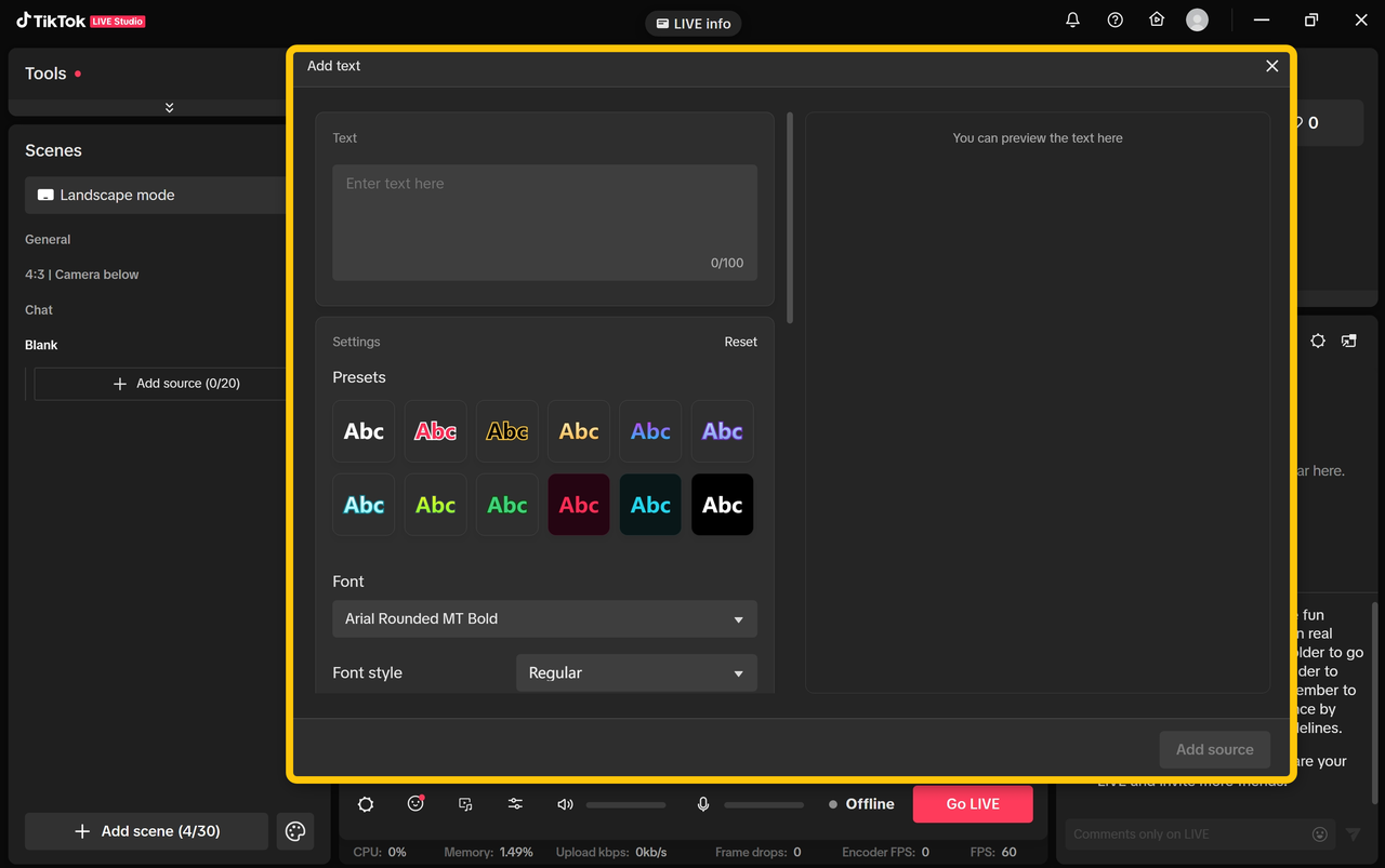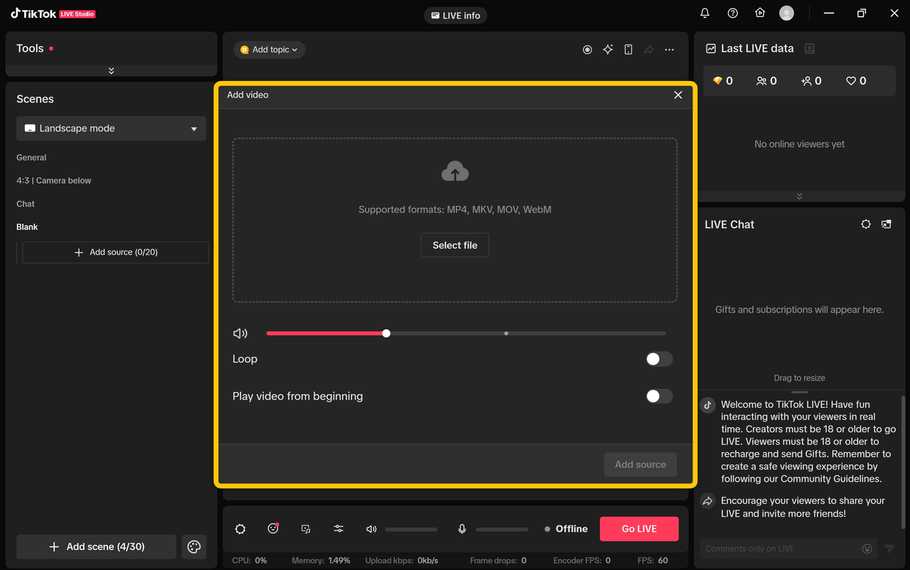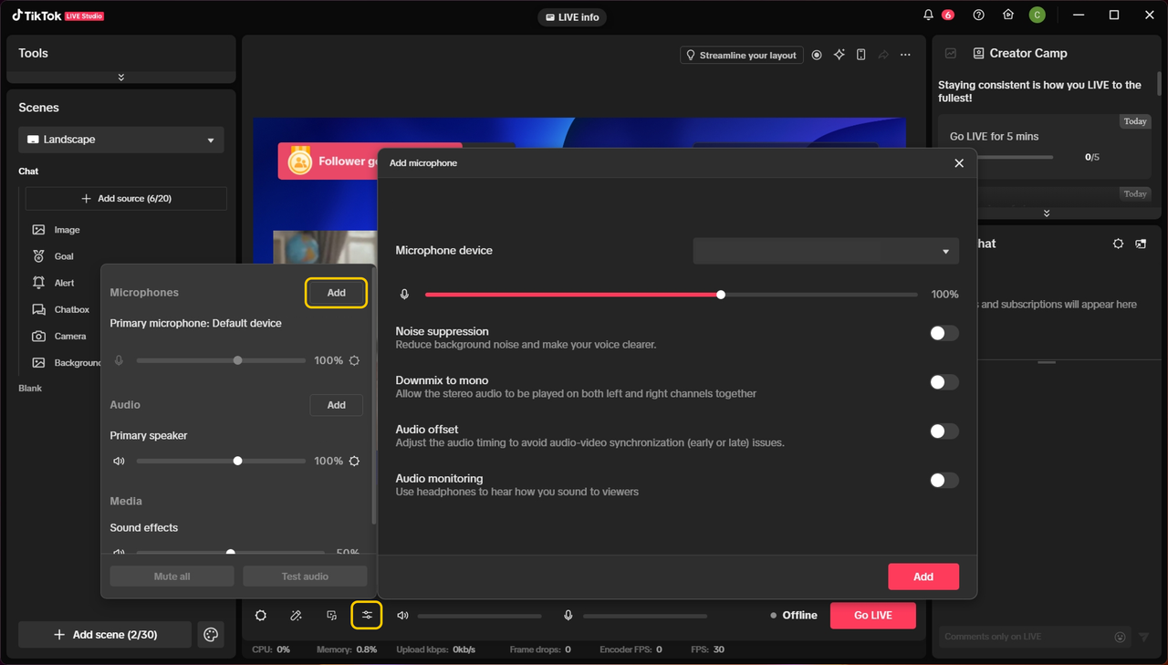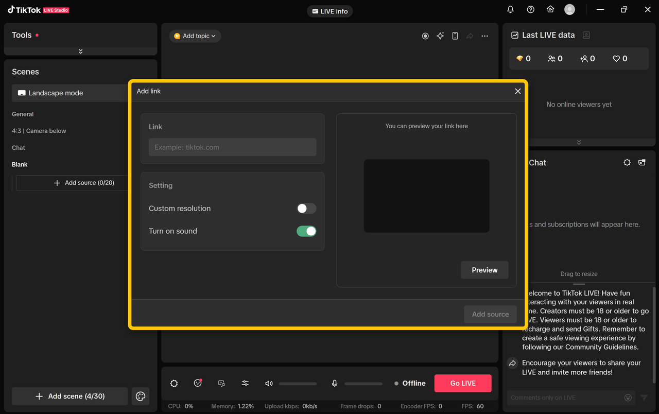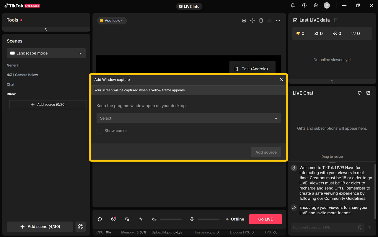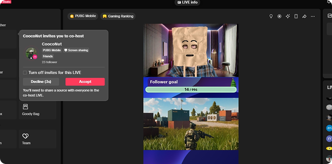 接受聯合直播邀請 在 LIVE Studio 或 TikTok 新增相機來源並開始直播後: