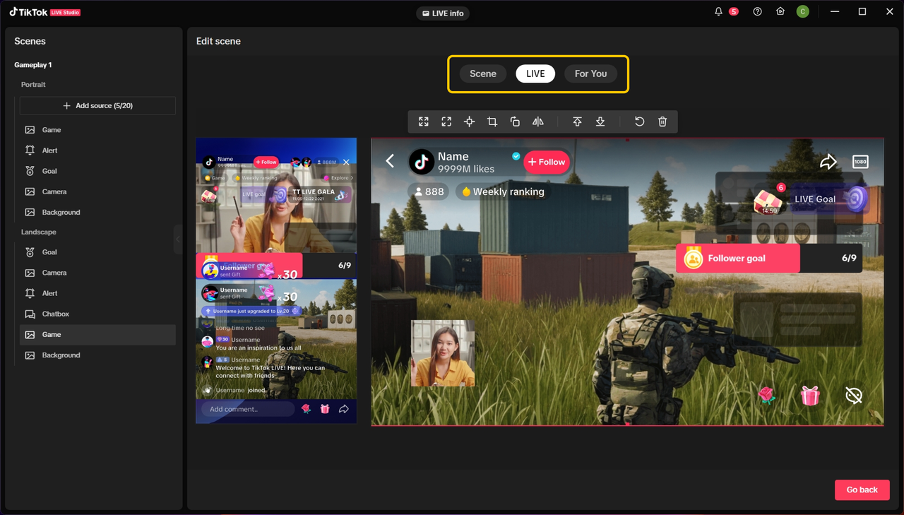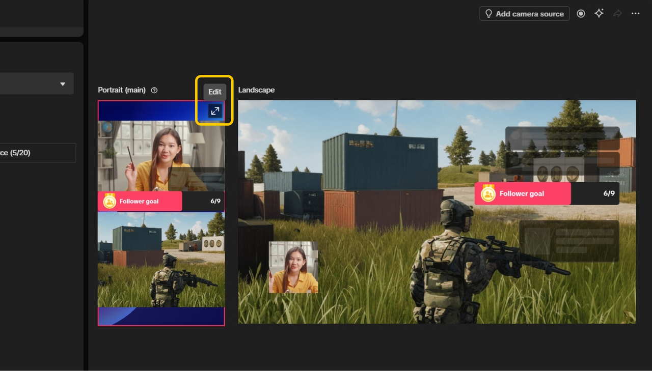 備註: (1) 雙版面:設定橫向和直向兩種版面並進行直播,讓您的觀眾可以選擇觀看直播的方式和地點,隨時獲得身歷其境的觀看效果。 (2) 橫向版面:非常適合分享寬螢幕格式的 PC 遊戲和其他內容。 (3) 直向版面:非常適合大多數以垂直手機螢幕觀看直播影片的 TikTok 使用者。 |