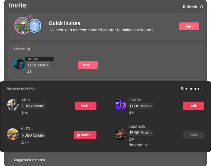 直播主可在 TikTok 上的聯合直播中,邀請最多 3 名直播主加入直播。邀請對象可以是建議的直播主,或是當時正在直播的好友。