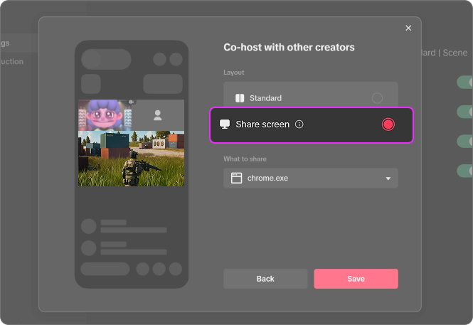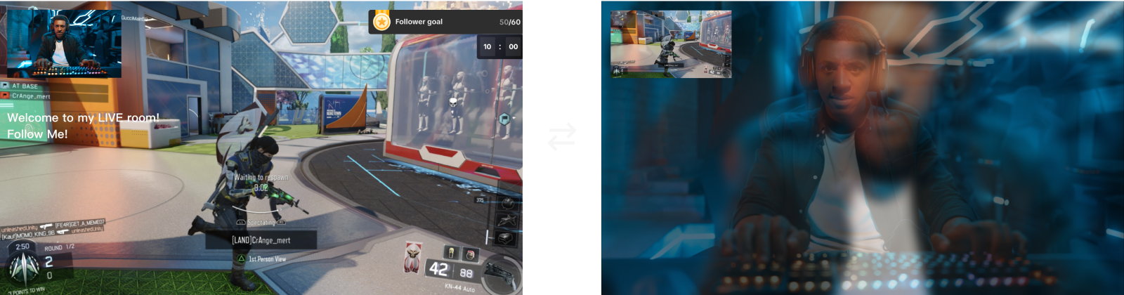 分享螢幕 使用「分享螢幕」版面時,所有直播主會在直播中分享同一個大型畫面,畫面可在不同直播主之間切換,讓觀眾看到所有視角,也讓直播主能夠進行遊戲實況報導。