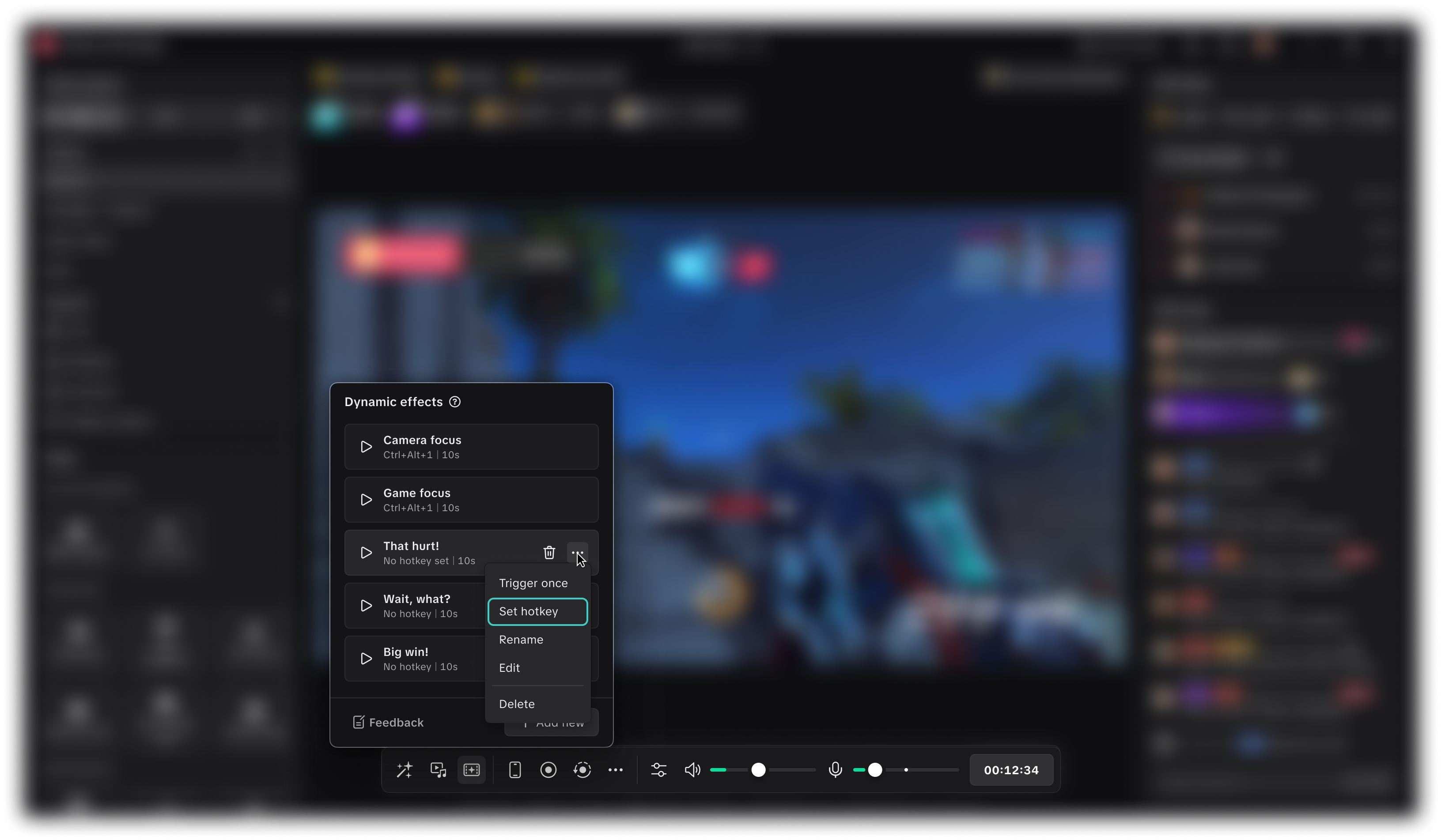 如何使用快速鍵以便即時存取? 若想在激烈的遊戲過程中流暢操控,可以為您喜愛的特效指定快速鍵。這樣一來,您就能立即觸發特效,完全不需開啟LIVE Studio視窗。