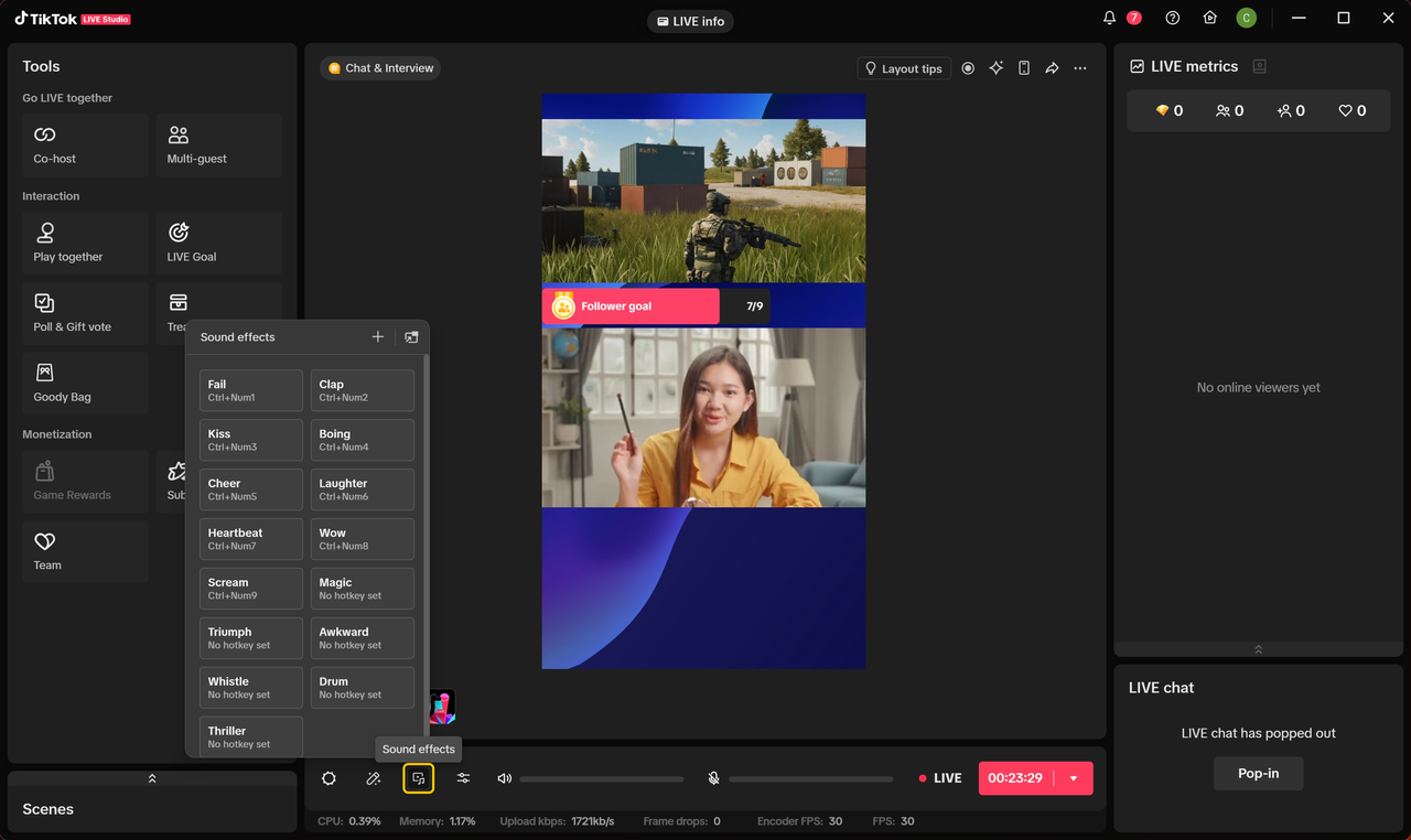 在直播中適當地播放音效 LIVE Studio 提供各式各樣的音效。在直播過程中,您可以在適當的時刻觸發及播放這些音效,讓觀眾投入並樂在其中。