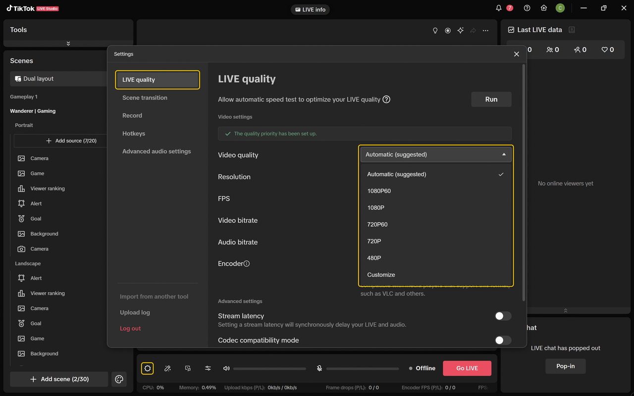 直播品質:根據您的網路速度和硬體效能調整影片品質設定。 LIVE Studio 建議您使用設定所能處理的最佳品質,以提供清晰流暢的觀看體驗。 您可以進一步調整這些設定,以符合個人偏好。